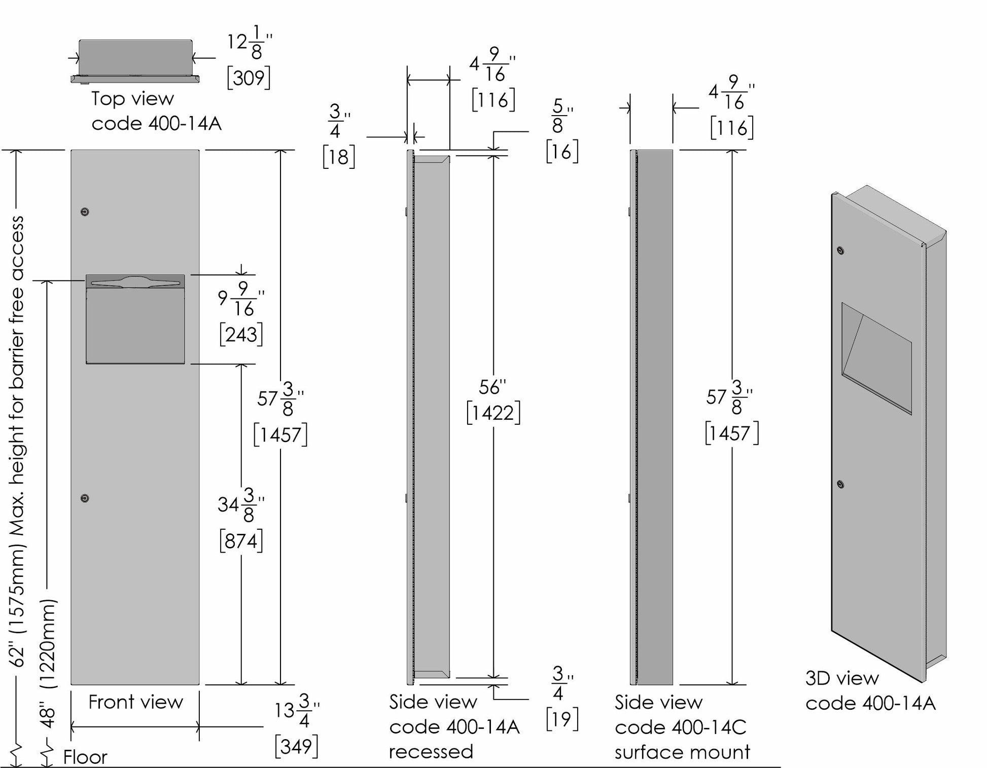 400-14A (encastré) : ouverture murale de 31,5 cm L × 143,2 cm H × 11,4 cm P (12,4" × 56,4" × 4,5")