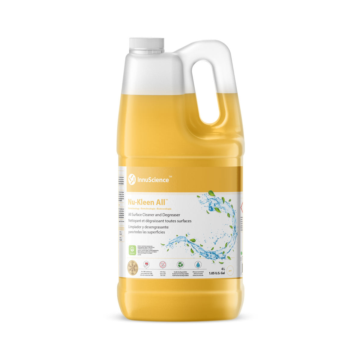 Nu-Kleen All est une solution biotechnologique à base d'enzymes conçue pour nettoyer tous les types de surfaces et de revêtements de sol. Il est sans danger pour tous les matériaux résistants à l'eau, ce qui le rend parfait pour le nettoyage quotidien dans un large éventail d'environnements. Grâce à sa formule enzymatique avancée, Nu-Kleen All offre un nettoyage puissant et efficace sans avoir recours à des produits chimiques agressifs, ce qui garantit que vos surfaces restent propres et protégées. Qu'il s'agisse de comptoirs, de sols ou de surfaces à fort contact, Nu-Kleen All offre un nettoyage en profondeur qui respecte les matériaux, est sans danger pour les utilisateurs et est respectueux de l'environnement. Simplifiez votre routine de nettoyage avec une solution qui travaille plus intelligemment, pas plus durement.