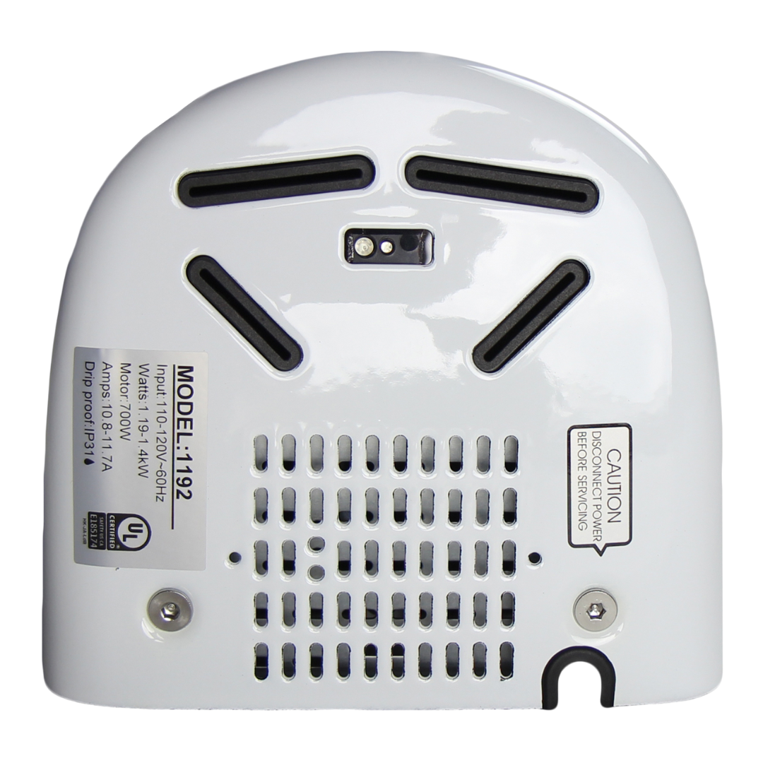 Le capteur sans contact s’active lorsque les mains sont placées dans la zone définie sous le bec (portée du capteur : 18 cm ou 7 po). Une lumière DEL bleue aide à cibler la zone de séchage idéale. L’unité est évaluée à 1600 watts : l’élément chauffant est de 900 watts, le moteur à balais avec roulements à billes doubles est de 700W, 18000 T/M. Le niveau sonore à 1 mètre est de 62.8 à 68.2 dB.